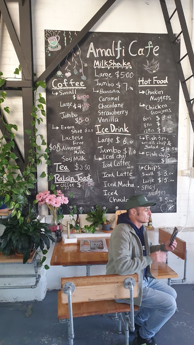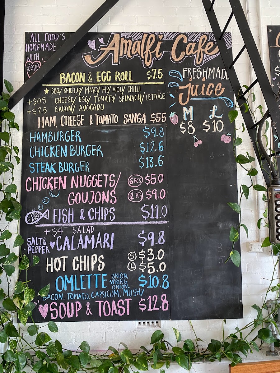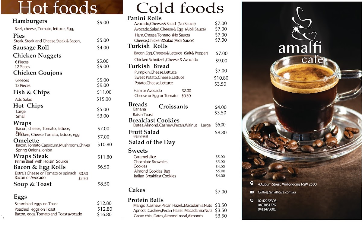 The menu at Amalfi Cafe and Coffee offers a selection suitable for breakfast, coffee breaks, and light meals throughout the day. The food options primarily include cafe-style dishes such as omelettes and sandwiches, as well as traditional takeout items like fish and chips served with a side salad. The beverage choices focus on various coffee preparations, including espresso-based drinks like cappuccino.