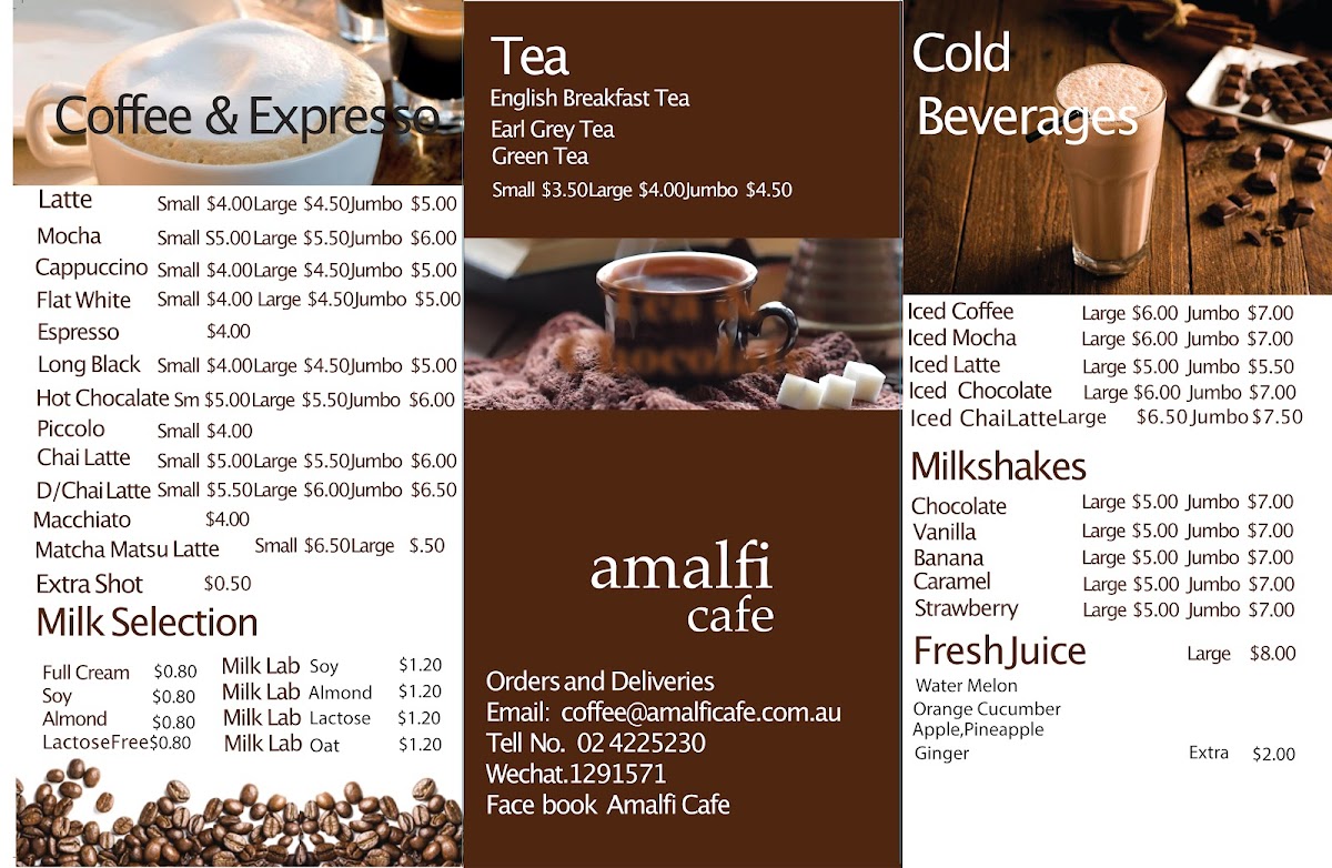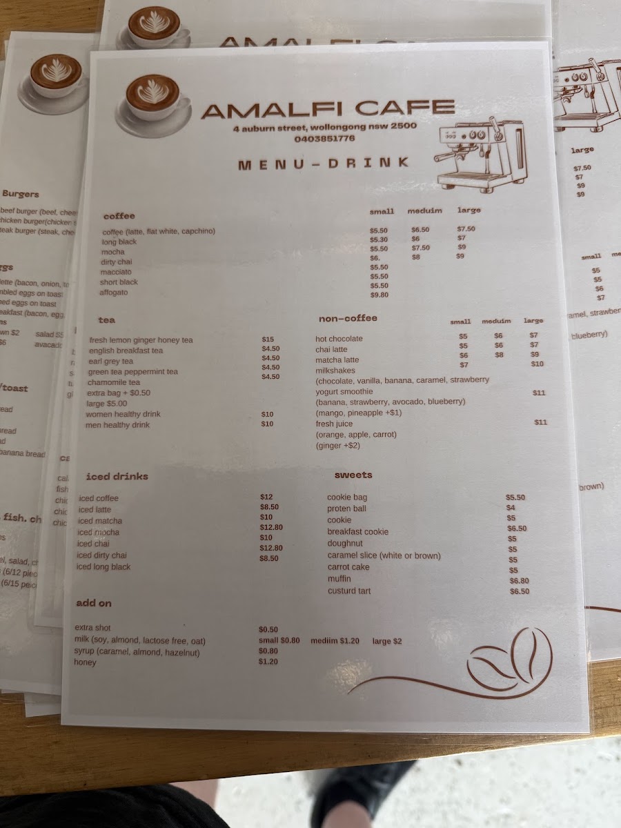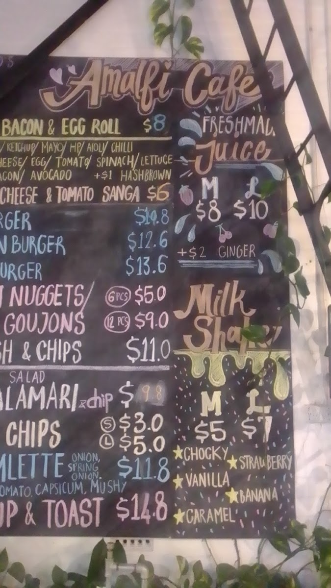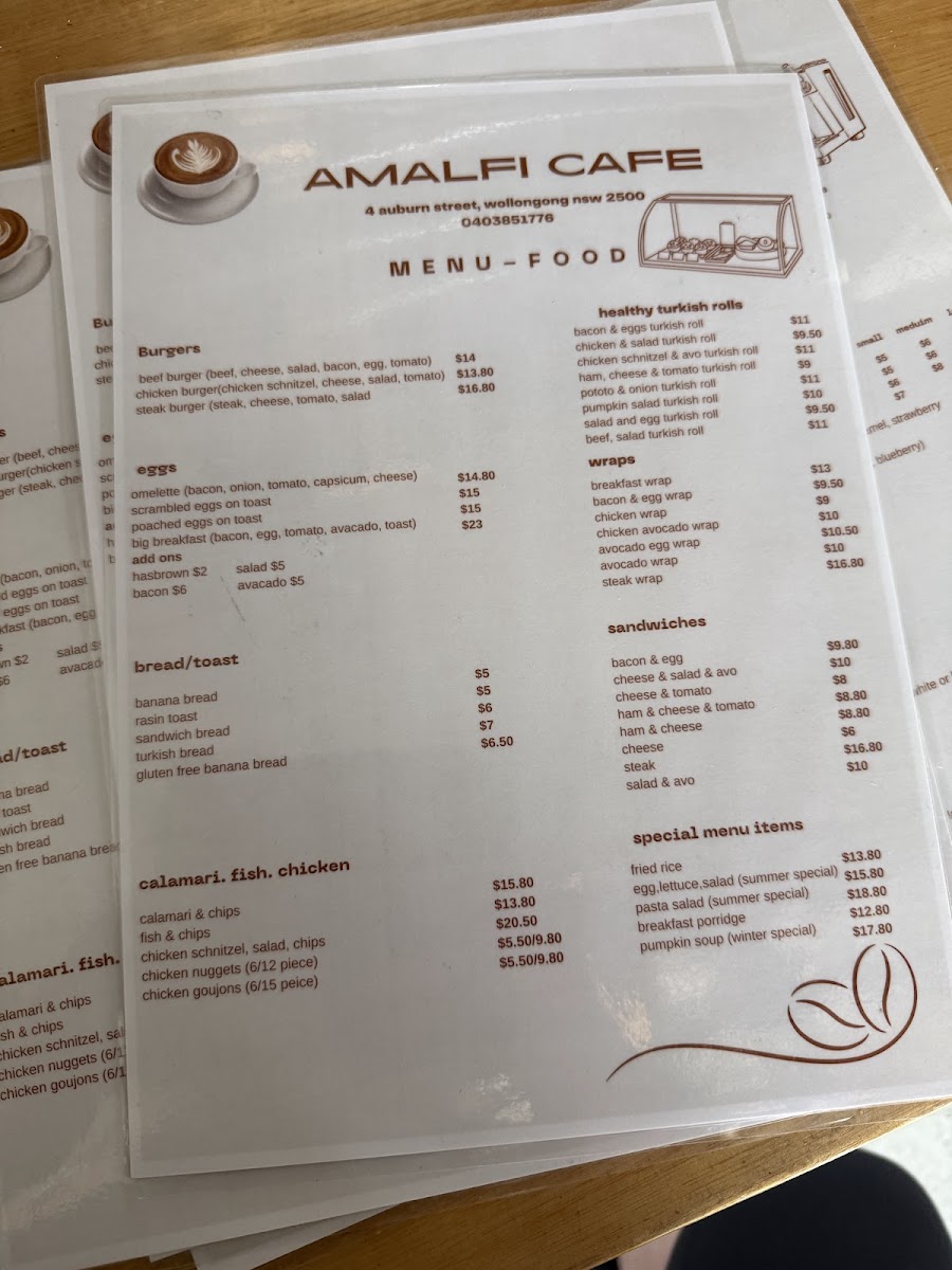 The menu at Amalfi Cafe and Coffee offers a selection suitable for breakfast, coffee breaks, and light meals throughout the day. The food options primarily include cafe-style dishes such as omelettes and sandwiches, as well as traditional takeout items like fish and chips served with a side salad. The beverage choices focus on various coffee preparations, including espresso-based drinks like cappuccino.